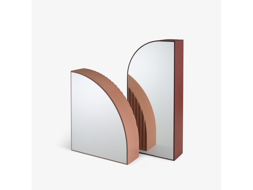 Geometrické formy, tlumené barvy, ornamentální předměty/sochy, styl Art Deco nadále inspiruje současný design. Každé ze dvou ručních zrcátek Arceau vyzařuje eleganci a přísnost. Velká verze je v rouge oxydé (rezavě červená) lakované MDF, zatímco malá verze je v rouge béžové, buď hladká nebo s vysoce grafickým drážkovaným efektem, a zrcadlovou stranou. Hra objemů, asociace pravých úhlů a měkkých křivek, je nesmírně sugestivní. Kromě jejich funkce jejich sochařské linie potvrzují jejich jedinečnou přítomnost v domácí sféře, bez ohledu na to, zda jsou používány samostatně nebo ve spojení.