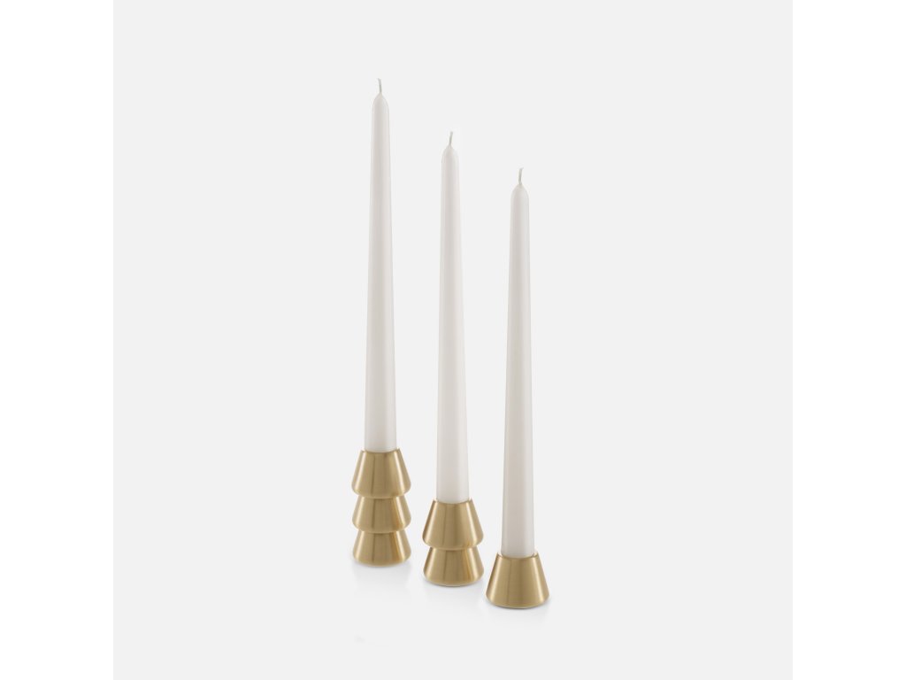 Stohovatelné svícny, které lze hravě poskládat na sebe nebo z nich vytvořit geometrické tvary v závislosti na počtu použitých svíček. Ke svícnům jsou k dispozici odpovídající svíčky. Saténová mosaz.