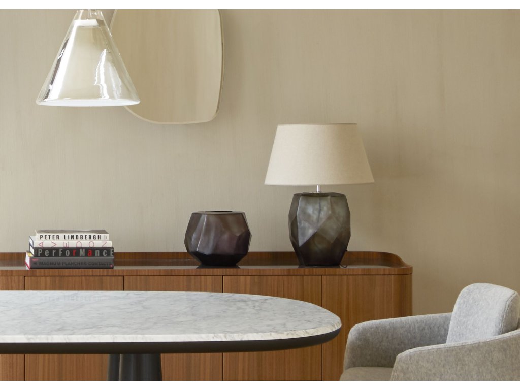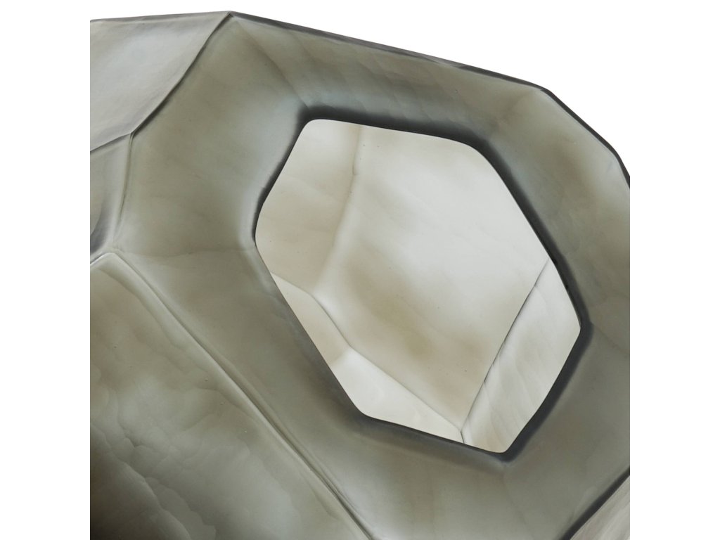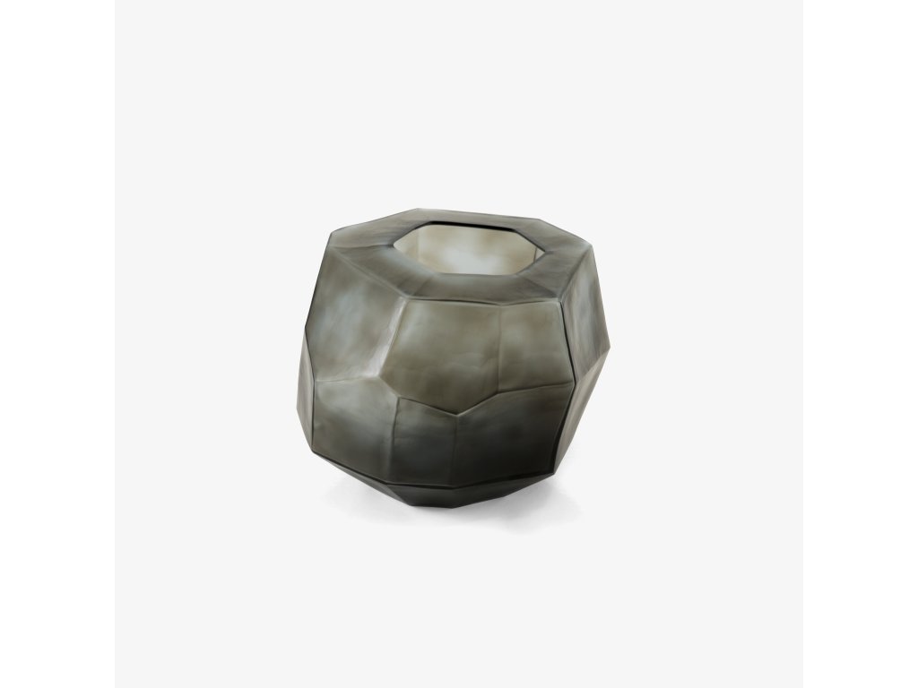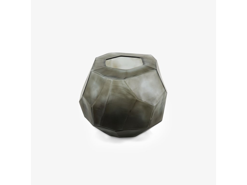 Asymetrická váza je vyrobena z litého tónovaného skla, s dvojitou vrstvou. Foukaná, lisovaná, sochařského tvaru, fasetovaná jako diamant, poloprůhledná povrchová úprava.