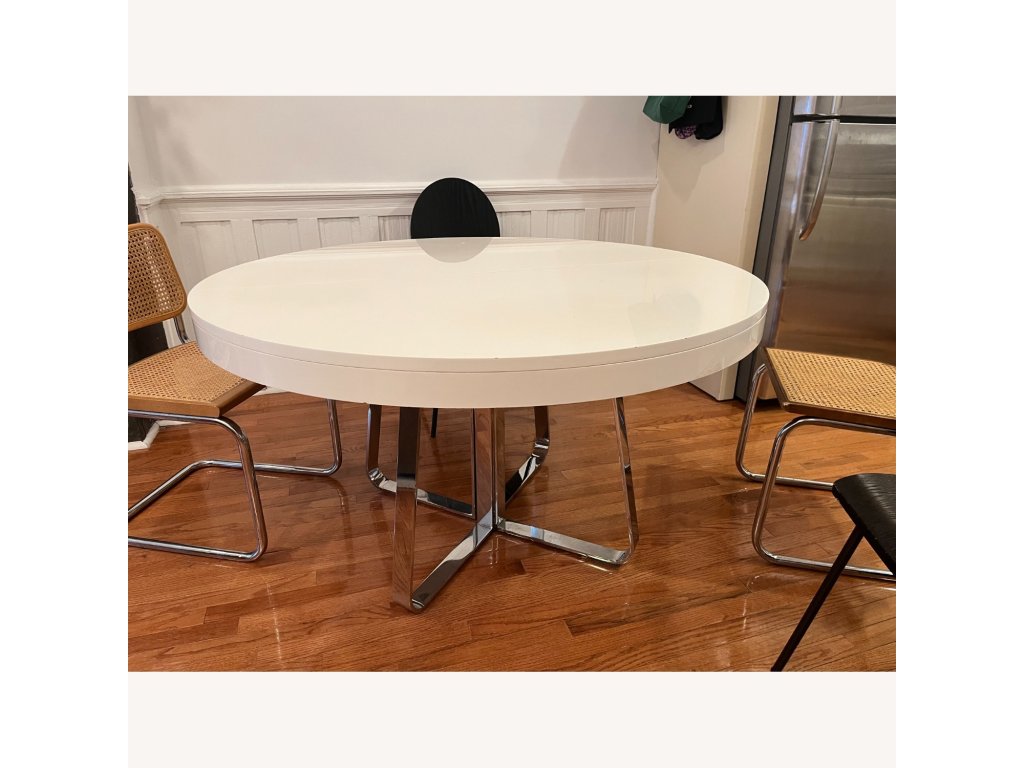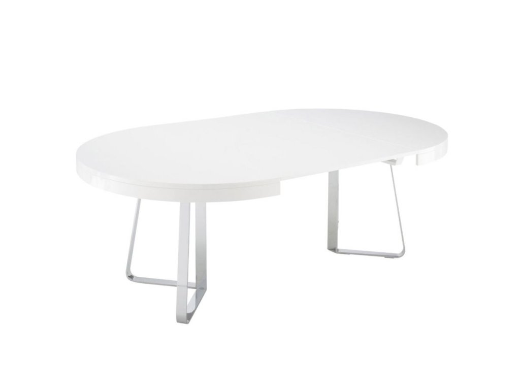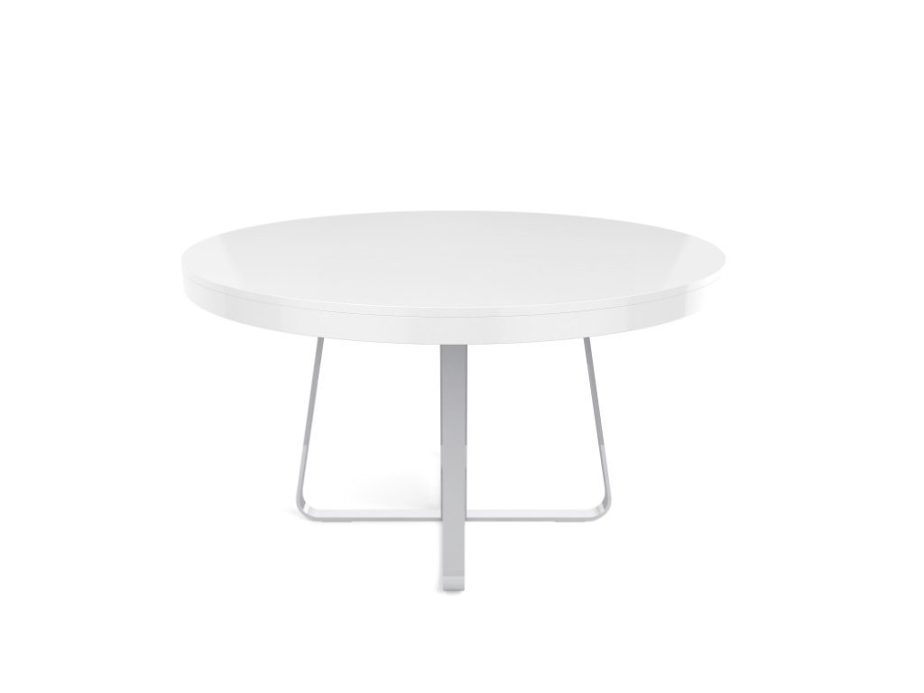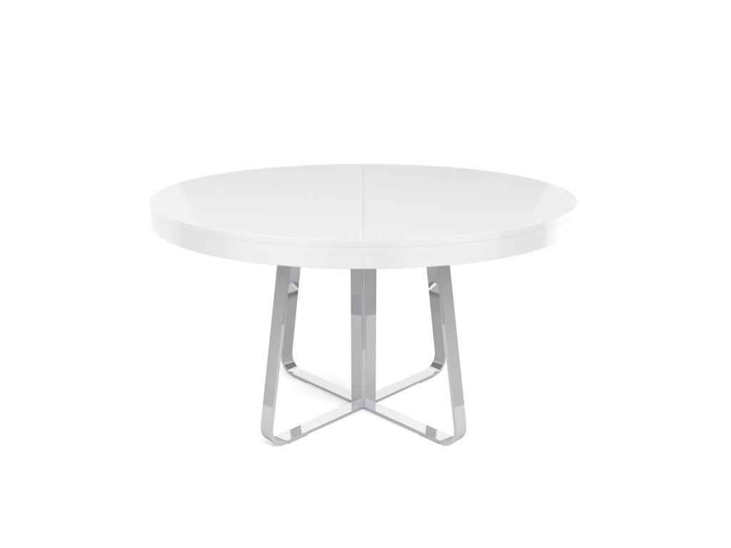 AVA jídelní stůl Ø 130 cm: Stůl s integrovanou skládací částí (š 87 cm). Středové podnoží je vyrobeno z bíle lakované, leskle chromované nebo černě chromované oceli a je rozdělena na dvě části (připevněné k vrchním deskám), které se od sebe oddalují, když chceme nástavec rozložit. U stolových desek v saténově bílém laku, ořechu, tmavém ořechu a černě mořeném jasanu je nástavec vždy sladěn s topy. U desek z bílé keramické kameniny s mramorovým efektem je nástavec vždy z MDF v bílé barvě Fenix. U jídelních desek z keramické kameniny emperador je nástavec buď sladěn s ostatním materiálem, nebo z MDF potažené dýhou z tmavého ořechu. Pro desky z keramické kameniny Marquinia je nástavec vždy z černě mořeného jasanového dýhovaného MDF. Tento stůl pojme 6 osob v zavřeném stavu nebo 8-10 osob s nasazeným nástavcem.