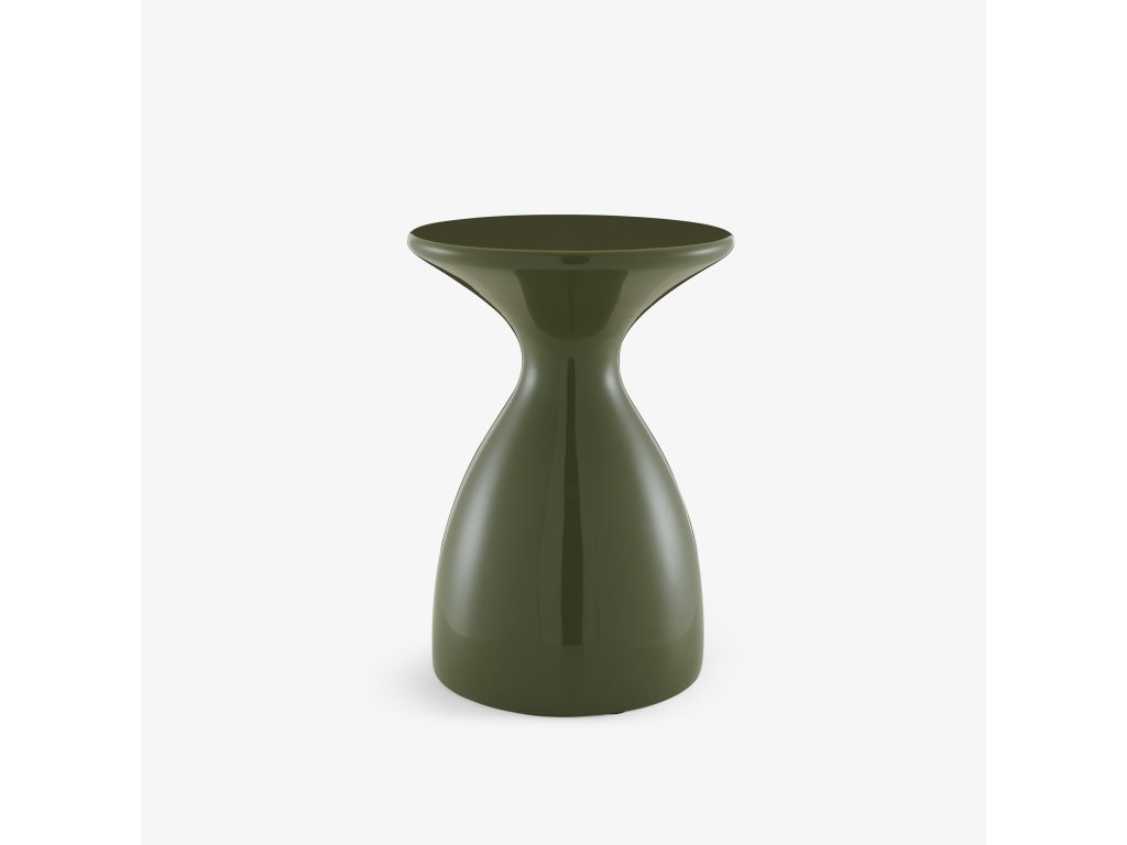 Stolička z černě mořeného masivního dřeva mangovníku nebo z formovaného sklolaminátu v khaki laku, lesklá povrchová úprava.
