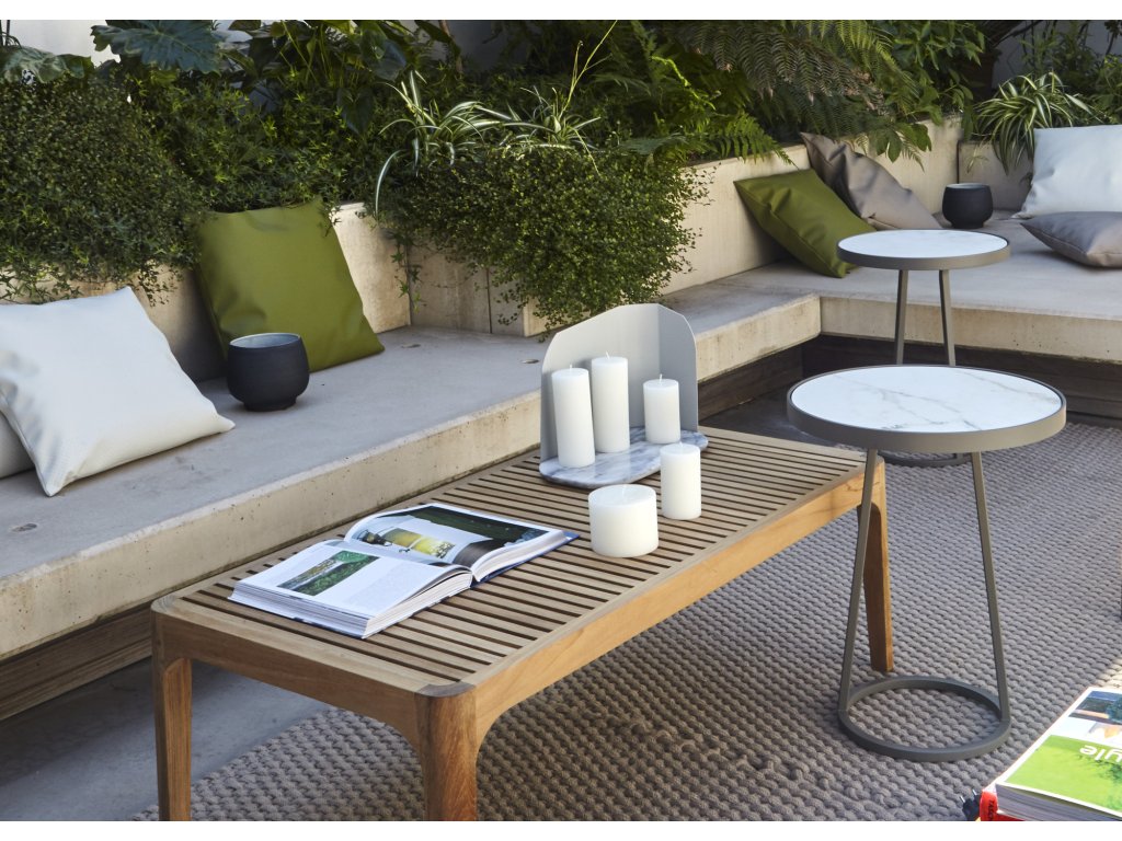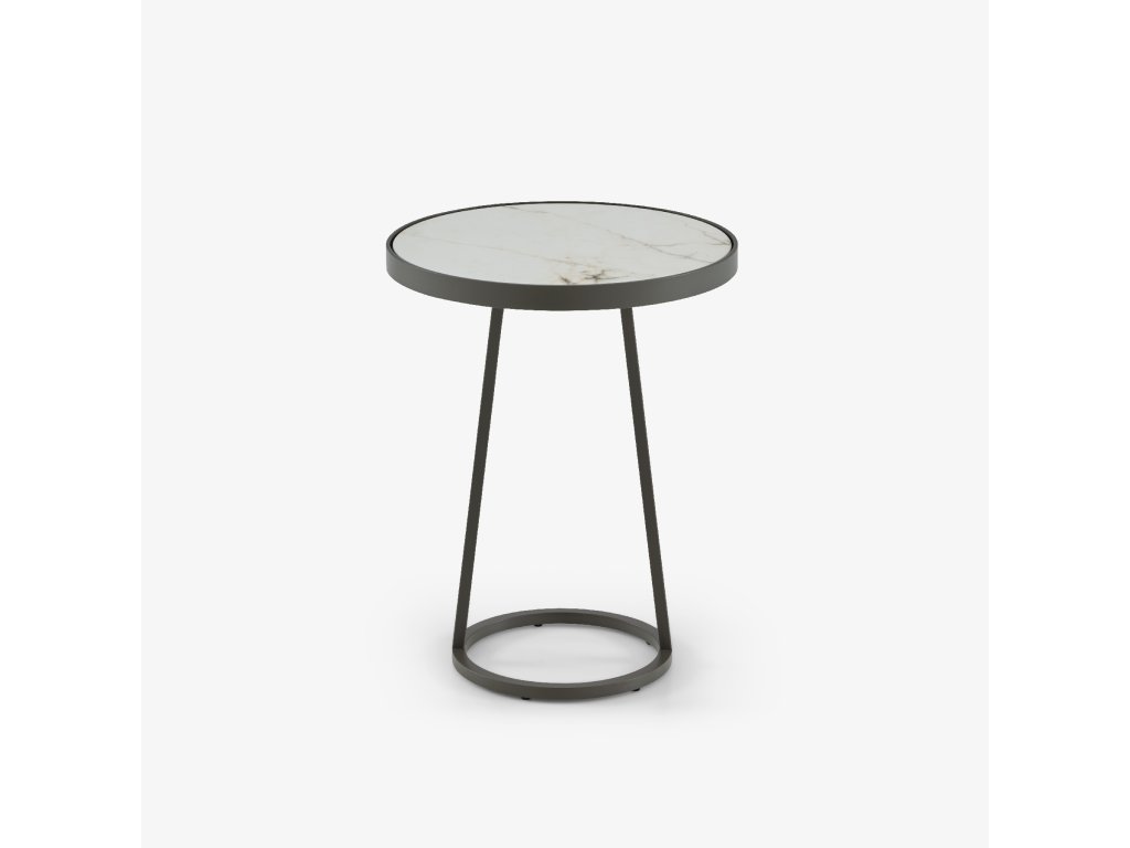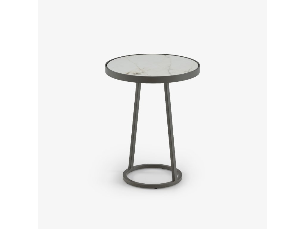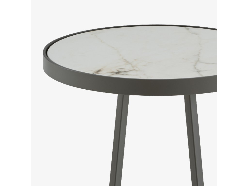 Venkovní podstavec se strukturou z křemenně šedé lakované kataforézně ošetřené oceli. Horní deska z matné bílé keramické kameniny s mramorovým efektem (Ø 40,5 cm; tloušťka 6 mm).