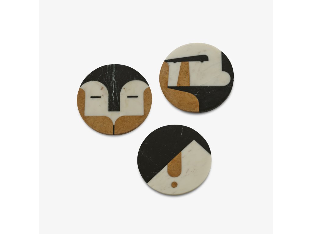 Podložka na stůl vyrobená ze 3 různých druhů slavných mramorů z Rádžasthánu (bílý mramor, černý mramor, světle hnědý mramor s názvem Forest Gold), které evokují tváře. Na každé podložce můžeme rozlišit jinou tvář: Aristotela, Danteho a Descarta, což umožňuje jejich odlišení. Estetické i funkční, mramor vydrží všechny teplotní rozdíly a korková podložka na spodní části zaručí izolaci s povrchem stolu. Každý kus mramoru je vyroben systémem řezání vodním paprskem a poté jsou kusy mramoru slepeny dohromady. Nakonec se pečlivě brousí a leští.