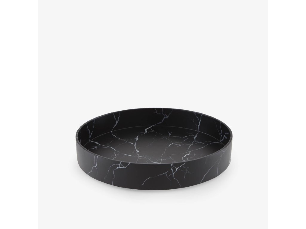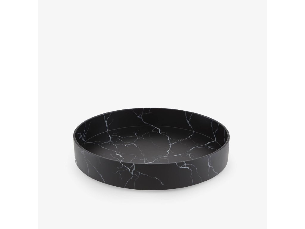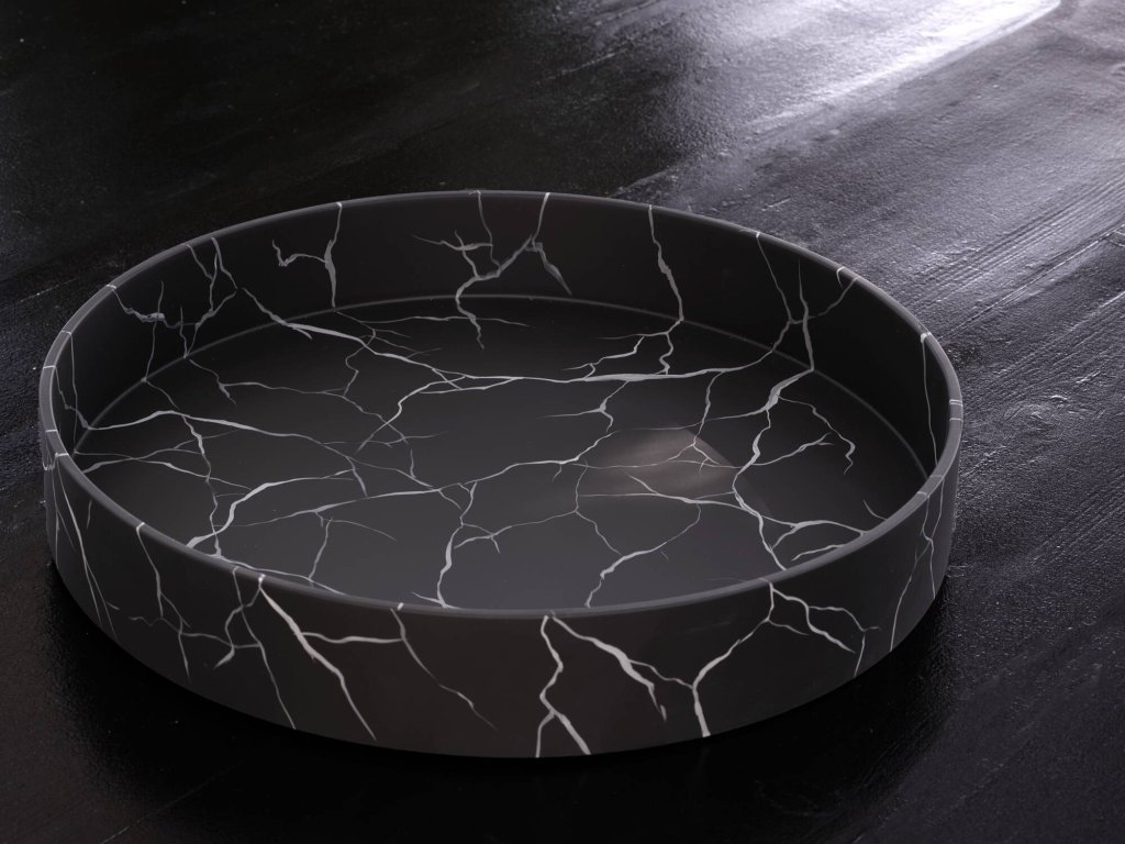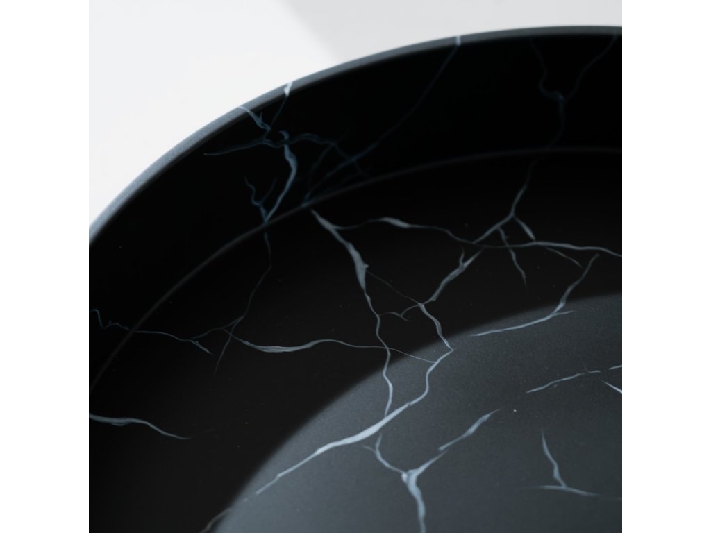 Tác z černě lakované MDF desky s ručně malovaným motivem imitující mramor. Stejně jako mramor, který napodobuje, je každý Fake tác jedinečným kouskem.