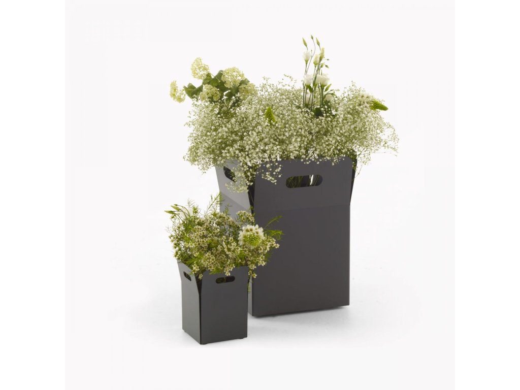 Navrženo tak, aby proměnil obal na květináč v moderní a elegantní kousek. Giardinetto je řada obalů na květináče inspirovaná způsobem, jakým člověk obdrží kytici květin. V tomto případě je však prezentační box zhotoven z odolného pozinkovaného ocelového plechu a povrchově dokončen jemným duhovým efektem. Antracitová barva.