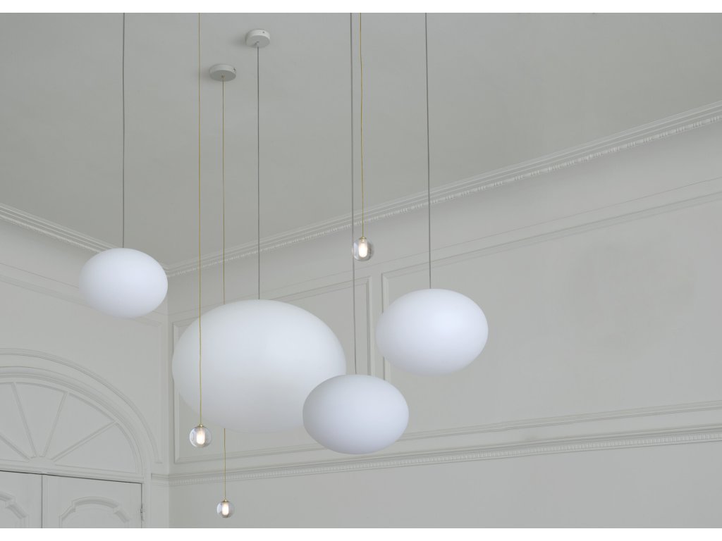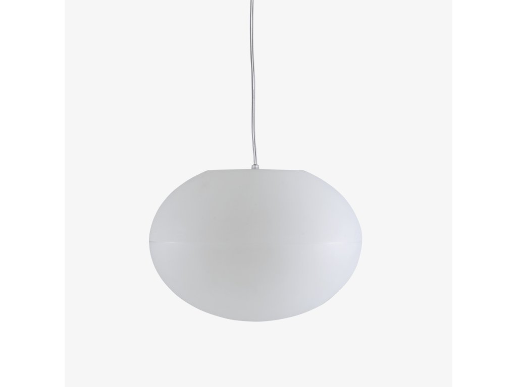 Závěsné svítidlo z bílého rotačně tvarovaného brokovaného polyetylenu (PE) (V 24 cm Ø 32 cm nebo V 30 cm Ø 40 cm). Průhledný PVC kabel o délce 150 cm. Hemisferické stropní kování v epoxidovém saténově bílém laku (V 2,5 Ø 10 cm). Dodáváno s 1 x 10W E27 LED žárovkou, 3 000 K (teplá bílá). 806 lumenů. Nestmívatelná LED žárovka.