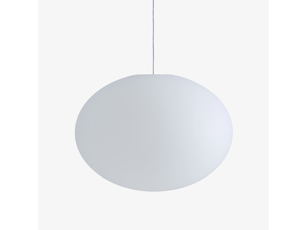 Závěsné svítidlo z bílého rotačně tvarovaného pískovaného polyetylenu (V 52 cm Ø 70 cm). Průhledný PVC kabel, délka 150 cm. Hemisferické stropní kování (Ø 10 cm / H 5 cm) s povrchem v epoxidovém saténově bílém laku. Dodáváno s 1 x E 27 13W LED žárovkou - 3000K (teplá bílá).