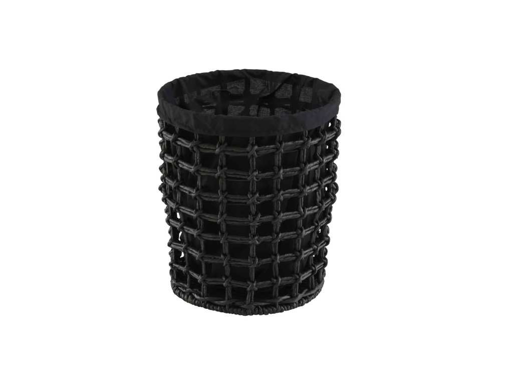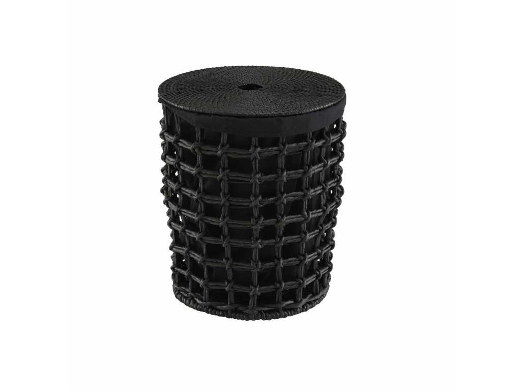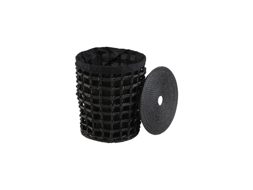 Koš vyrobený z železného drátu omotaného černě mořeným vodním hyacintem s tkaným ratanovým víkem. Vyrobeno ve Vietnamu. Vodní hyacint roste ve vodě a jsou to právě jeho usušené listy, ze kterých se tká. Volitelný černý látkový sáček (100 % bavlna) může sloužit k ukrytí všeho, co je v něm uloženo. Může být použit jako koš na prádlo, box na hračky nebo i koš na papírový odpad.