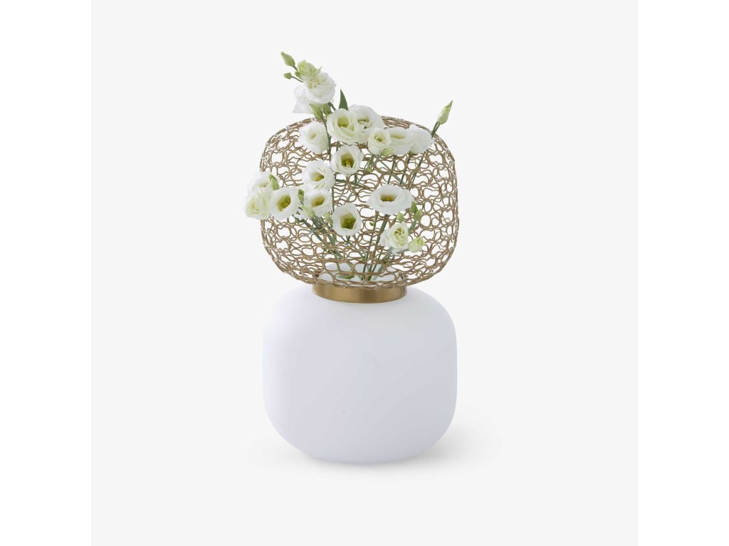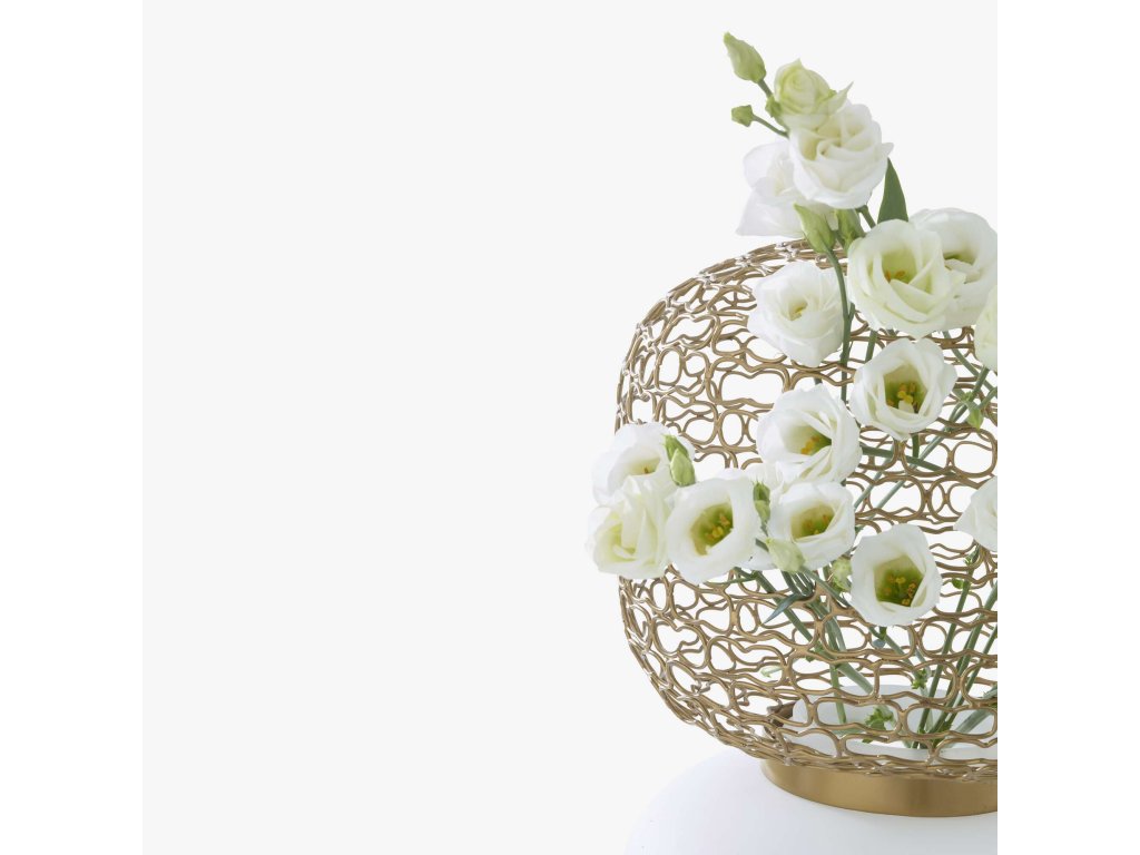 Složením dvou předmětů (řemeslně vyrobené mosazné síťované koule a koule stejných rozměrů z opálového skla) vznikne váza zakončená mřížkou, kterou lze provléknout květiny, což umožňuje skutečně kreativní aranžmá. Samostatně může být každý předmět také stolní lampou, přičemž opál rozptyluje měkké, jednotné světlo a síťovina promítá svůj stín vysoce dekorativním způsobem (viz stolní lampa). Váza s opálovým podstavcem (Ø 24 cm / v 22 cm) zakončená mřížkou ze saténově čirého lakovaného postříbřeného mosazného drátu.