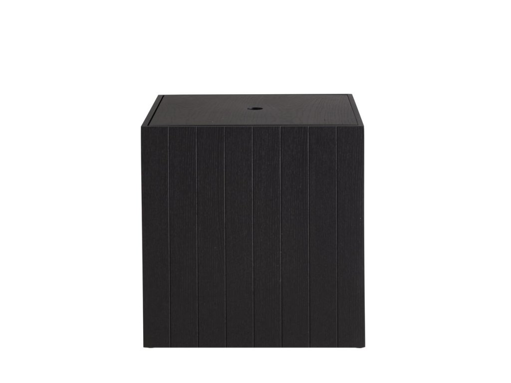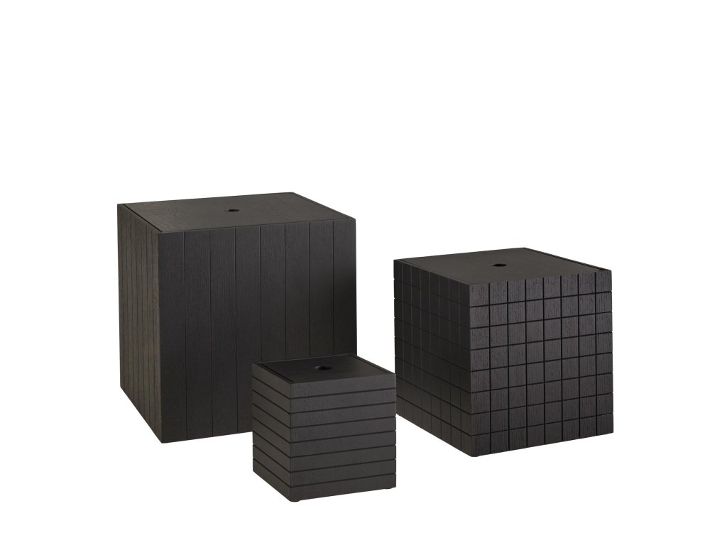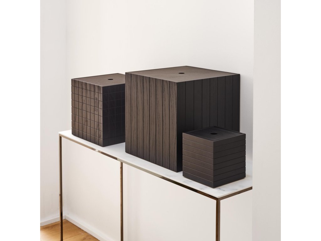 Boxy z masivní černě mořené dýhované MDF desky z jasanu v saténovém povrchu. Jejich tloušťka umožňuje vytvořit sochařsky jemné linie, které jsou na každé krabici jiné. Odnímatelné víko (bez drážek) z masivního jasanu. Ideální pro uložení předmětů, textilií nebo drobností. 3 boxy, 3 funkce.