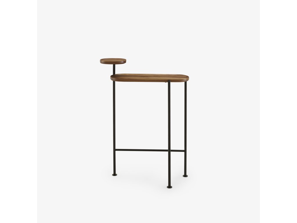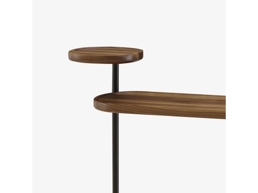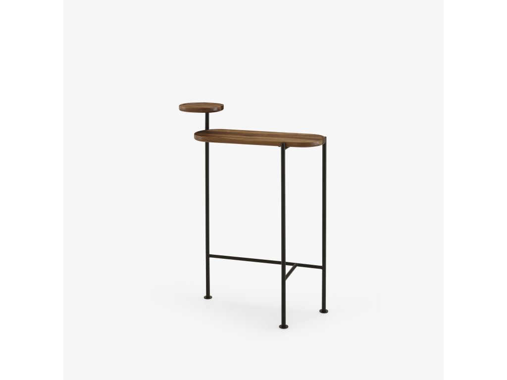 Konstrukce ze saténově černé trubkové oceli Ø 2 cm a horní desky z přírodního saténově lakovaného masivního amerického ořechu. Je nutné připevnění ke stěně. Výše uvedené rozměry představují celkové rozměry stolku. Rozměry desky jsou Š 60 D 24, tloušťka 2,5 cm; rozměry poličky jsou Š 20 D 20, tloušťka 2,5 cm. Vybaven 3 nastavitelnými jacky.