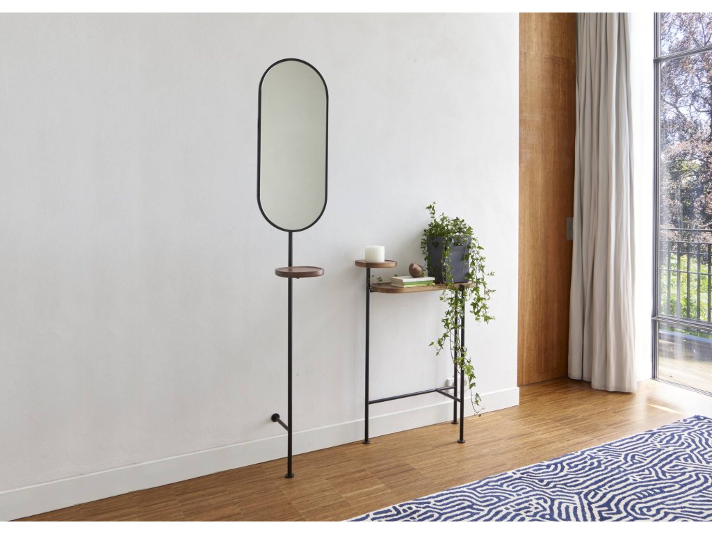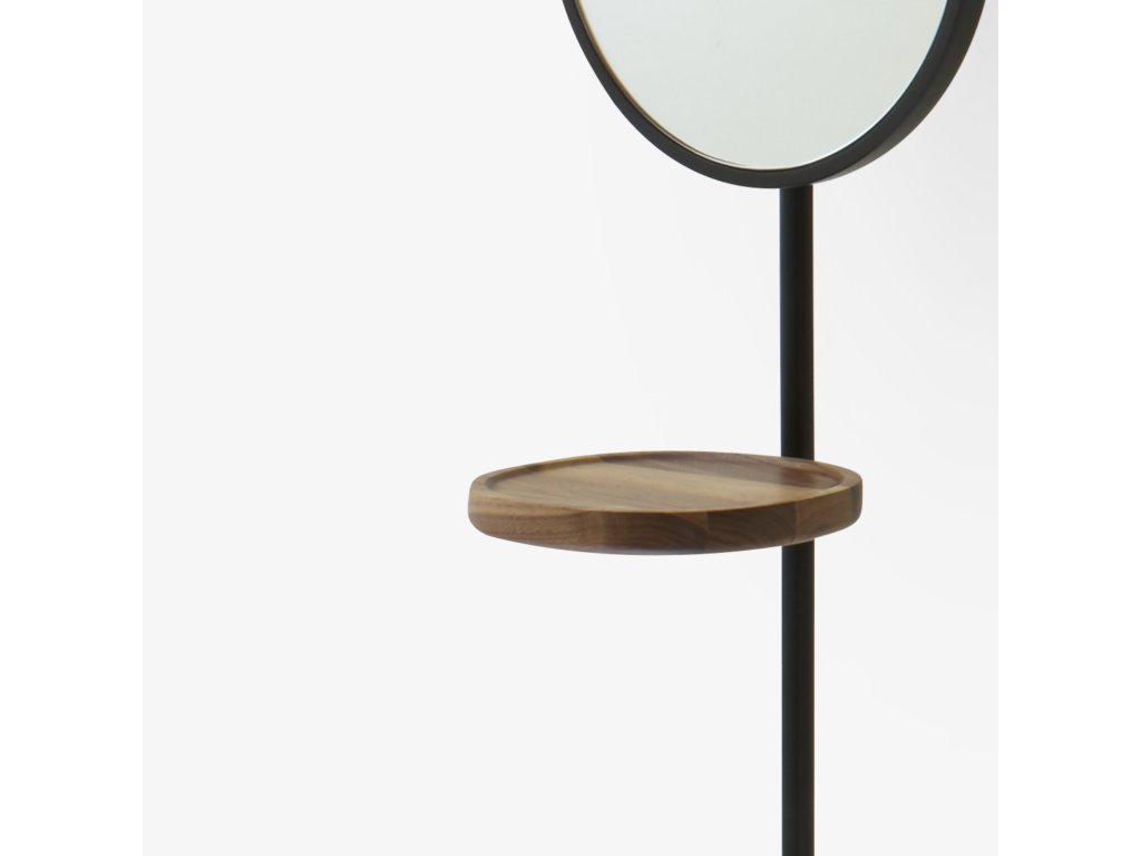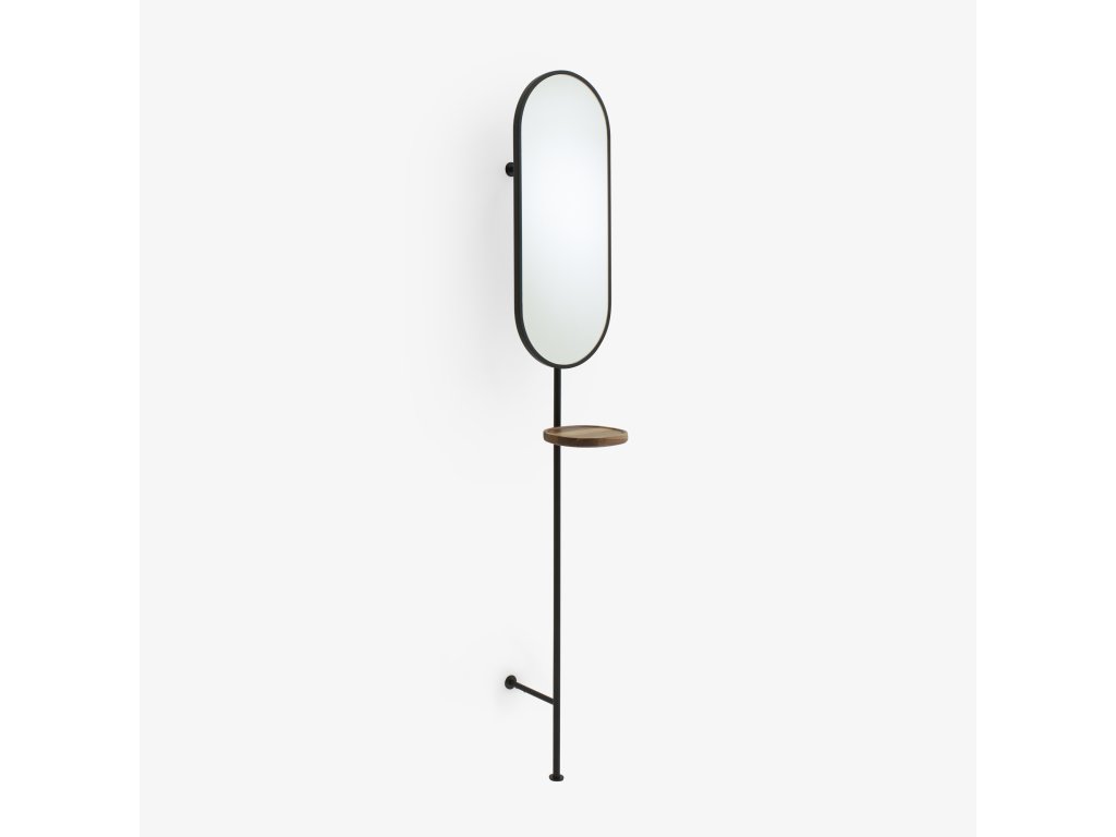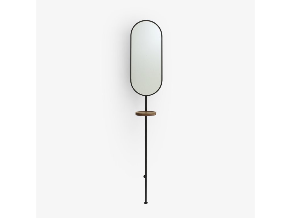 Konstrukce ze saténově černé ocelové trubky Ø 2 cm ; polička (20 x 20 x 2,5 cm) z přírodního saténově lakovaného amerického ořechu. Zrcadlo V 76 Š 32, tloušťka 2,5 cm. Věšák je vybaven nastavitelnými zvedáky a je nutné připevnění ke stěně. Zadní strana zrcadla je vybavena závěsnou lištou.