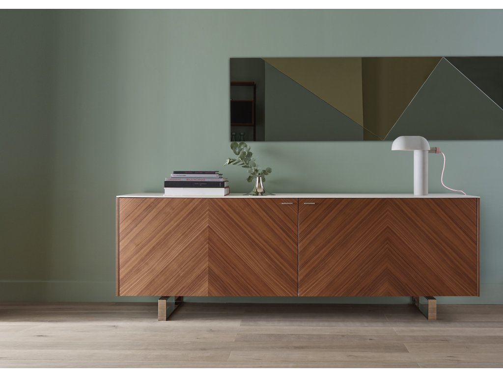 Zrcadlo složené z trojúhelníkových nebo lichoběžníkových kusů čirého, bronzového nebo kouřového skla (tloušťka 4 mm, masově barvené) nalepené na MDF podložce. Lze zavěsit vodorovně nebo svisle. Výše uvedené rozměry se vztahují k zrcadlu při svislém zavěšení.