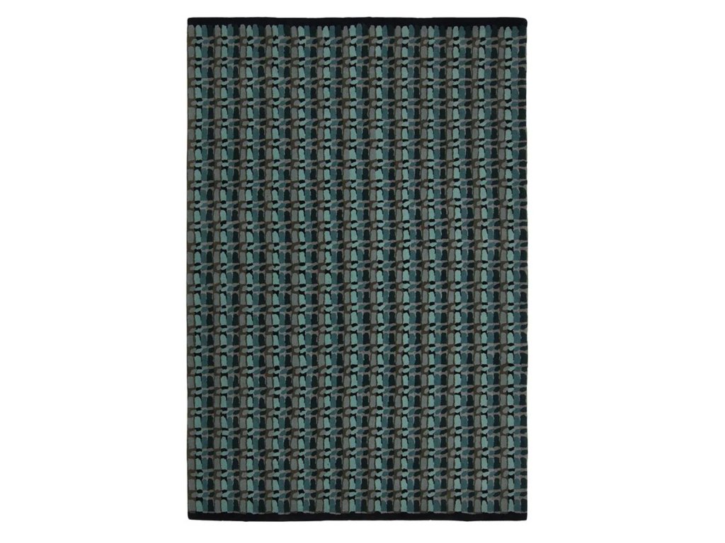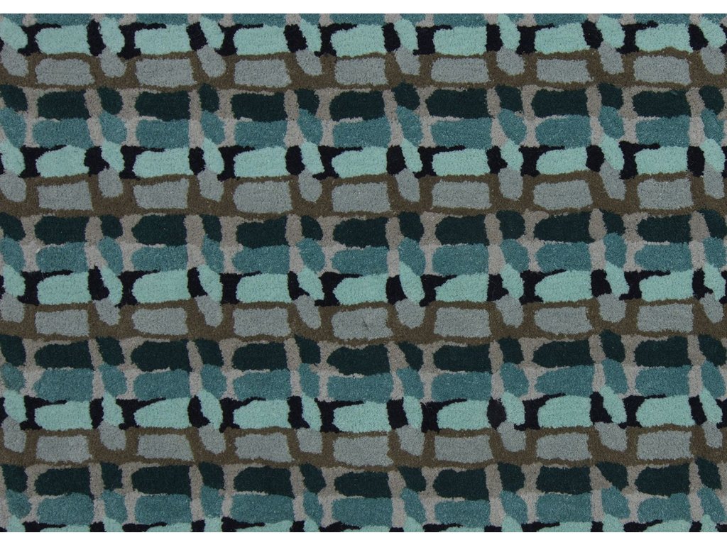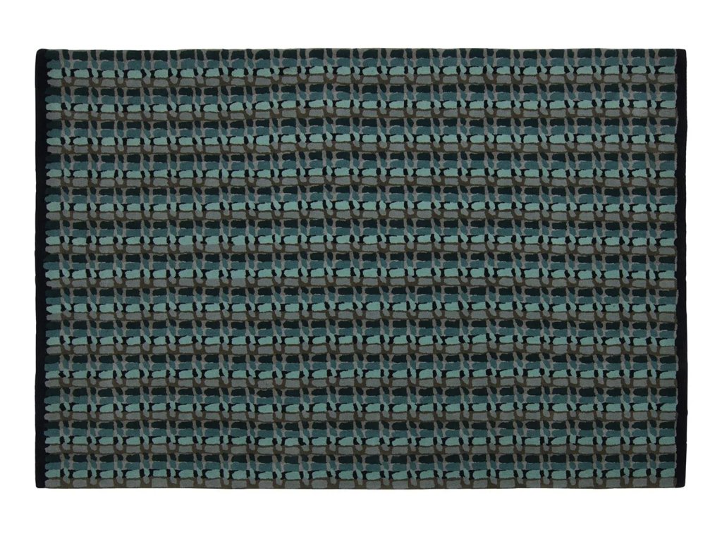 Velmi atraktivní grafický koberec. Marie-Aurore zvolila jemné tóny vert d’eau (aqua), s tmavším tónem pro zvýraznění. Ručně všívaný koberec ze 100% vlny.