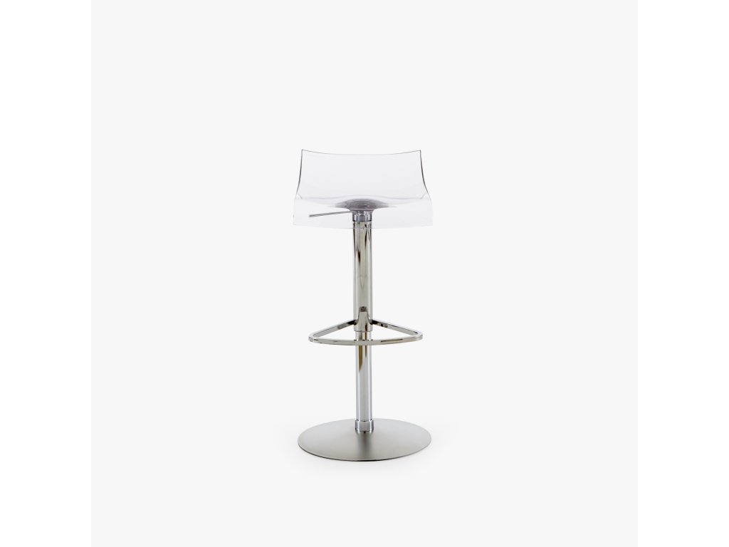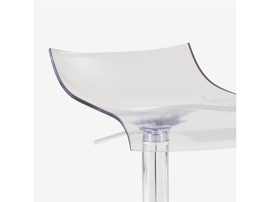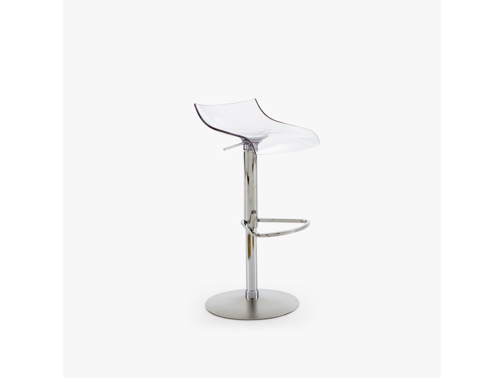 Pístová stolice s průsvitným pláštěm z PMMA. Matně chromovaný kovový rám a lesklá chromovaná podnožka. Výše uvedená výška a rozměry sedadla odpovídají nejvyšší poloze. Pro nejnižší polohu mají výšku 65 cm a sedák 54 cm.
