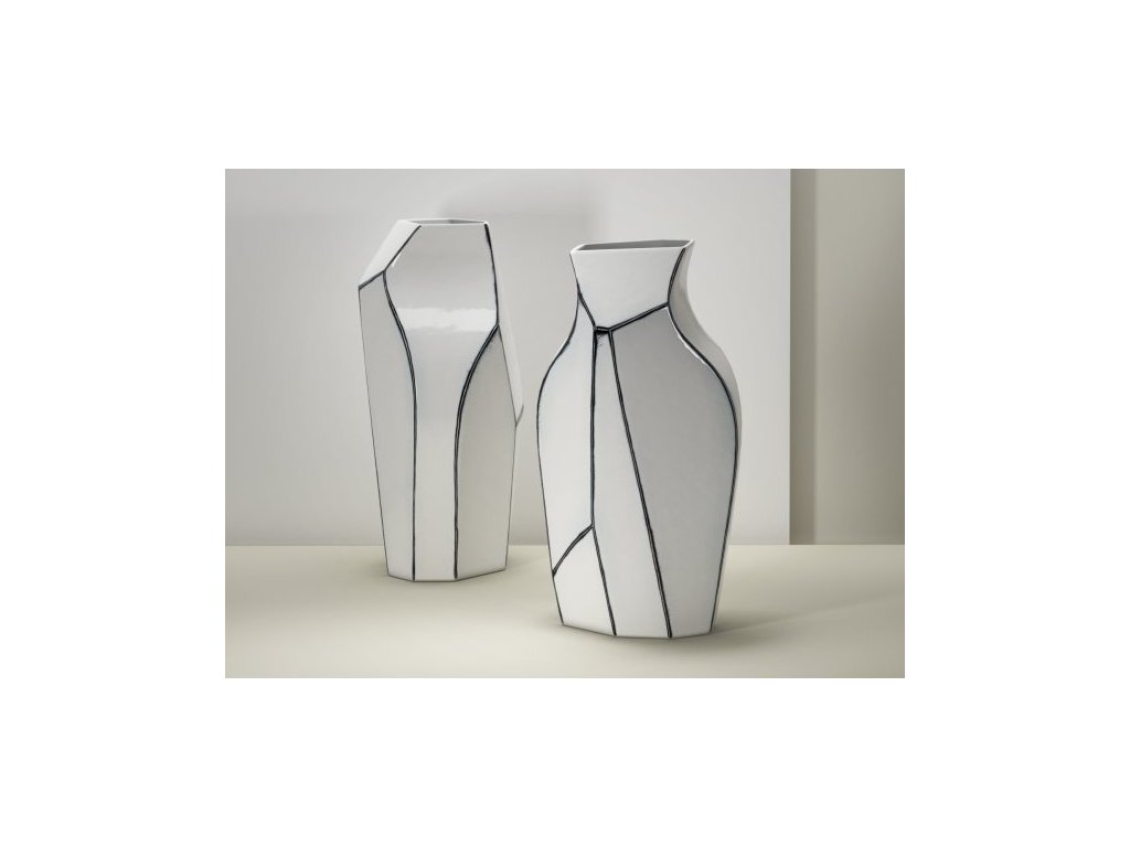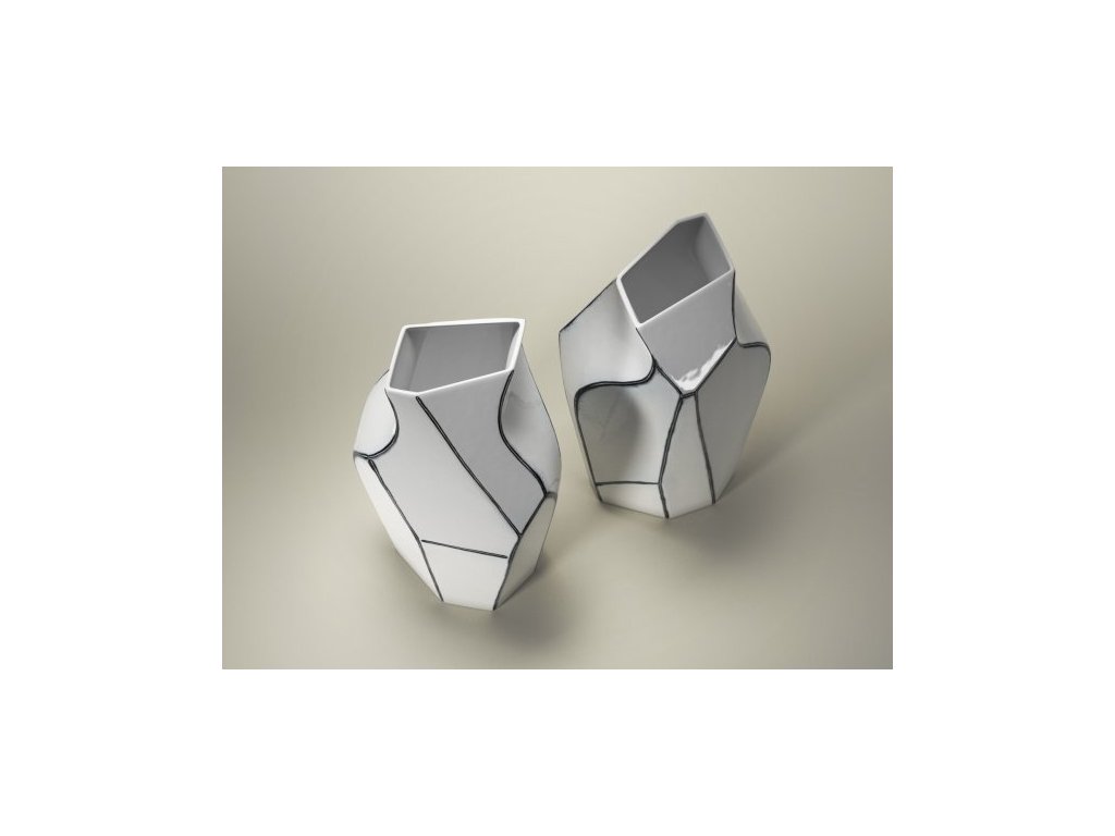 Váza z lesklé bíle smaltované lité kameniny s podpisem designéra. V případě černobílé verze jsou všechny okraje natřeny černou barvou.