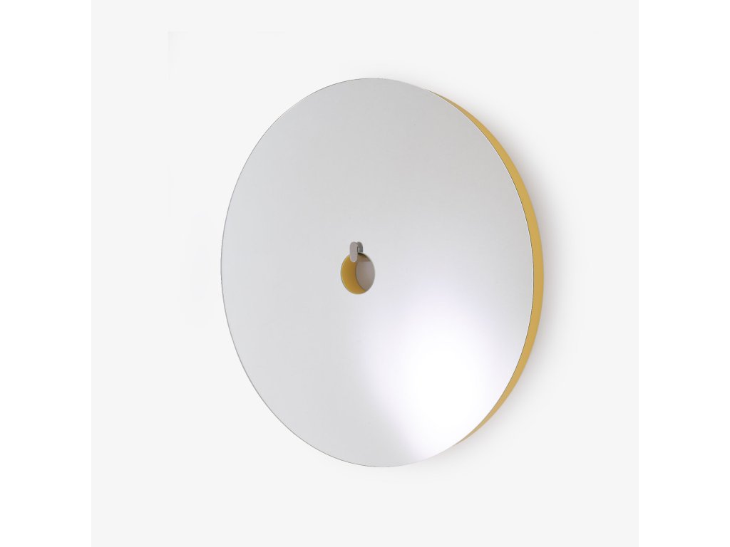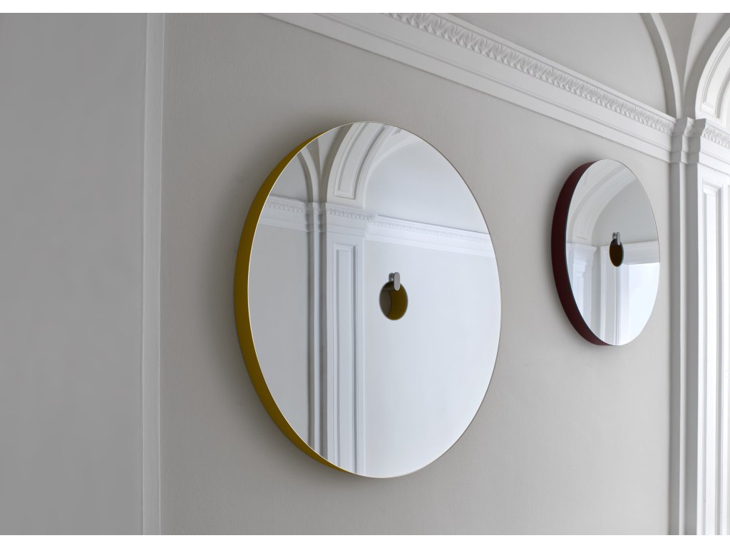 Velká verze : nástěnné zrcadlo ve vícevrstvém provedení s okrajem v barvě jaune d'or. Háček z kartáčované nerezové oceli.