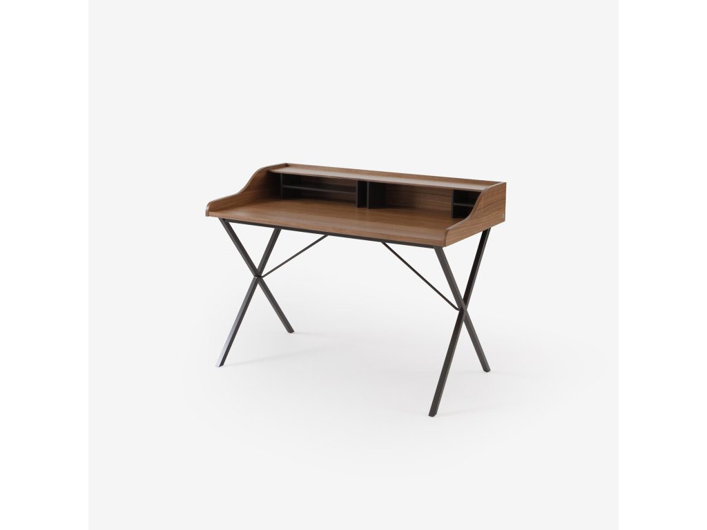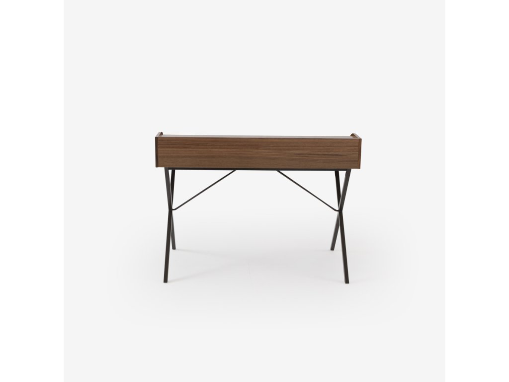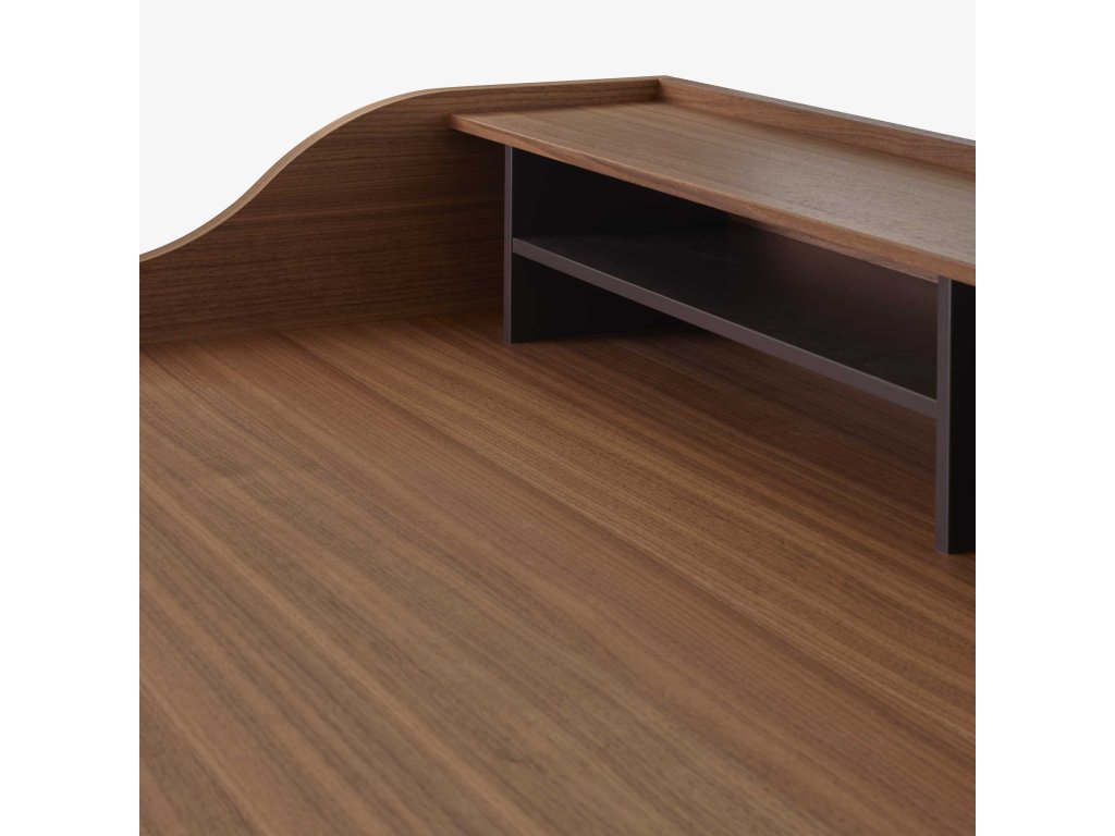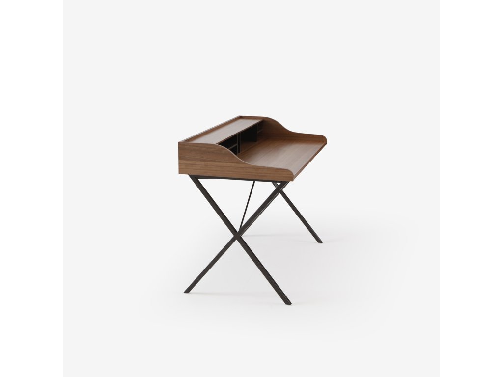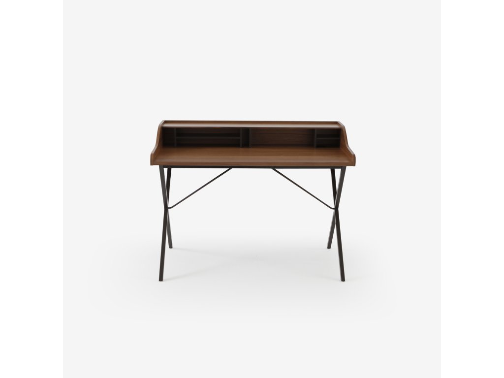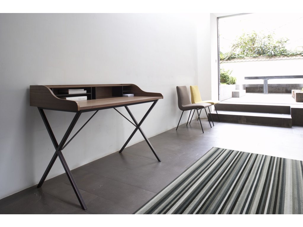 V kolekci Ligne Roset tento půvabný bytový stůl svým ženským půvabem doplňuje psací stůl Tanis (1954 / 2008), jehož vzhled je mužnější a přísnější. Psací stůl s pracovní deskou, truhlami a lemováním z dřevotřískových desek a MDF. Křížová základna z epoxidově lakované trubkové oceli. Povrchová úprava: celá v saténovém bílém laku nebo vrchní části a lemování s povrchovou úpravou z přírodní ořechové dýhy;