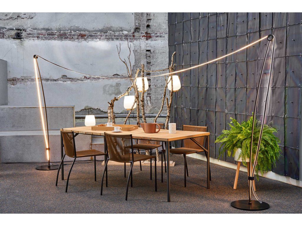 Venkovní LED páska (délka 8 m – šířka 20 mm – tloušťka 7 mm) s celkovým příkonem 80 W a světelným tokem 8 300 lumenů (odpovídá 500 W žárovce). Teplota barev 3 000 K (teplá bílá). Stupeň krytí: IP 65 pro pásku, napájecí kabel a vypínač. Průhledná PVC ochrana proti povětrnostním vlivům, černá zadní strana. 5 m černý gumový kabel. Černý vypínač. Napájecí zdroj a vypínač jsou umístěny 80 cm od zástrčky (tedy 4,20 m kabelu mezi napájecím zdrojem a začátkem pásky). Lze použít jako girlandu s jedním nebo dvěma rameny (další ramena se účtují zvlášť). Mírně zakřivená trubková ocelová tyč Ø 20 mm je opatřena epoxidovým saténově černým lakem RAL 9005. Základna Ø 42 cm, tloušťka 12 mm. Celková výška tyče a základny: 190 cm. Jeden konec LED pásky lze připevnit ke zdi, například pomocí nástěnného držáku (rozměry 40 x 40 x 30 mm). LED páska je upevněna mezi dvěma pryskyřičnými částmi nástěnné podpěry. Jedna část je připevněna ke zdi, druhá k první (s LED páskou vloženou mezi nimi). Podpěru lze také připevnit k háku (V 190 x H 88 x Š 40 mm), což umožňuje připevnit konec LED pásky k slunečníku nebo větvi stromu.