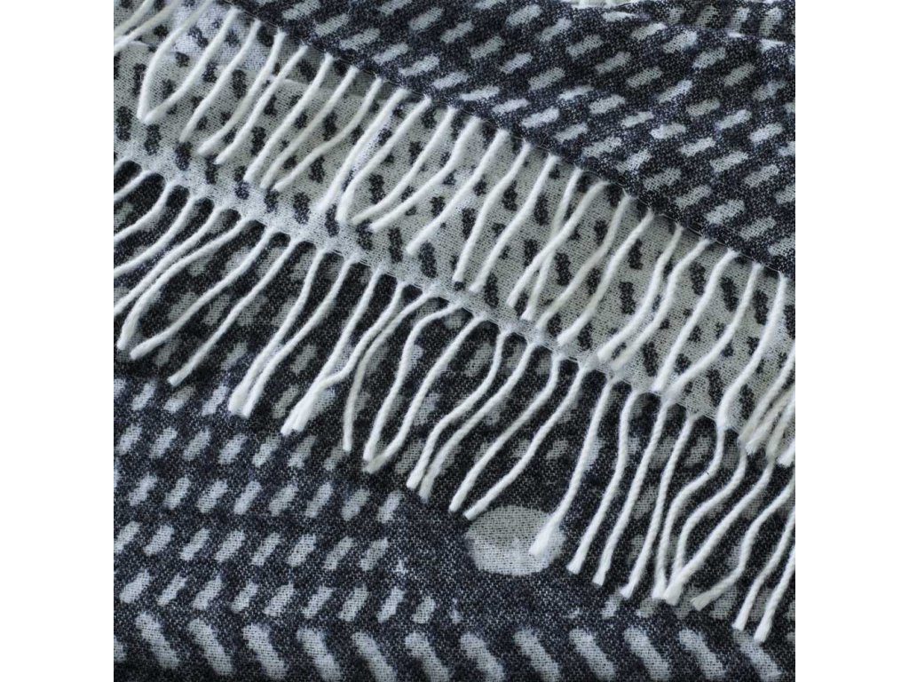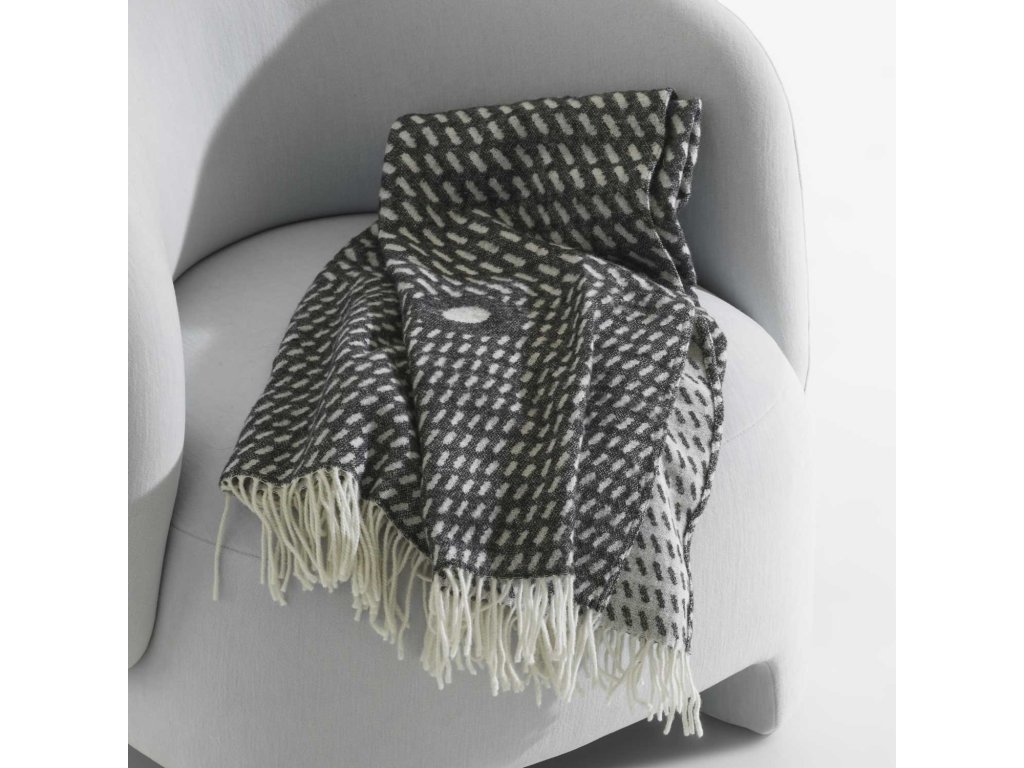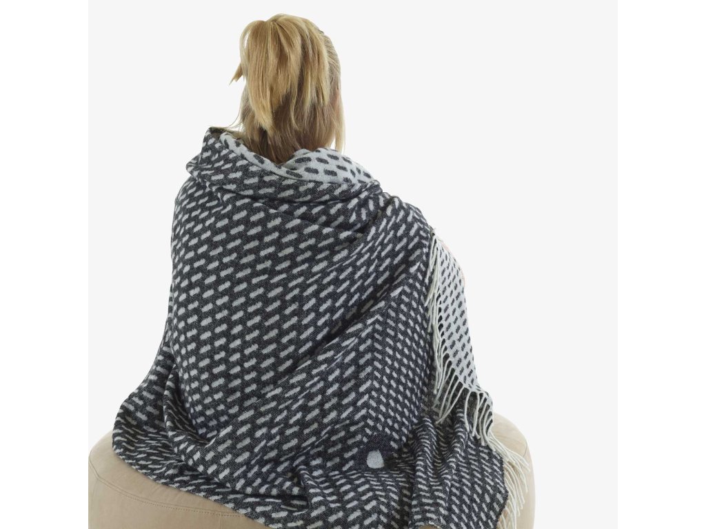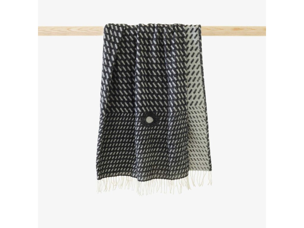 "Přehoz, který se na vás dívá": dvě obrazné oči jsou propleteny tón v tónu, aby tomuto přehozu dodaly poezii i humor. 2 barvy: antracit a curry. 70 % vlna / 30 % polyamid; Strojně tkaný (žakár) s dvouokým motivem.