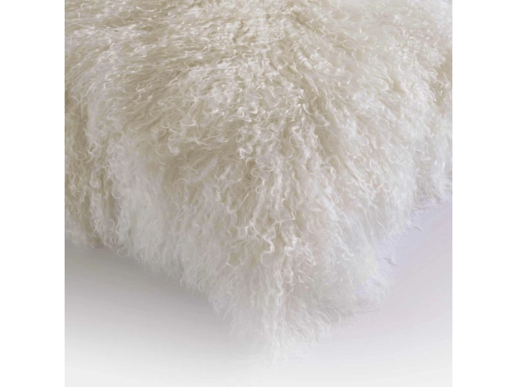 Polštář s povlakem z mongolské kozí kůže s dlouhým kudrnatým vlasem. Zadní strana je z látky se semišovým efektem (100% polyester). Vnitřek je vyplněn polyesterovou vatou proti prachu a roztočům. Zapínání na zip.