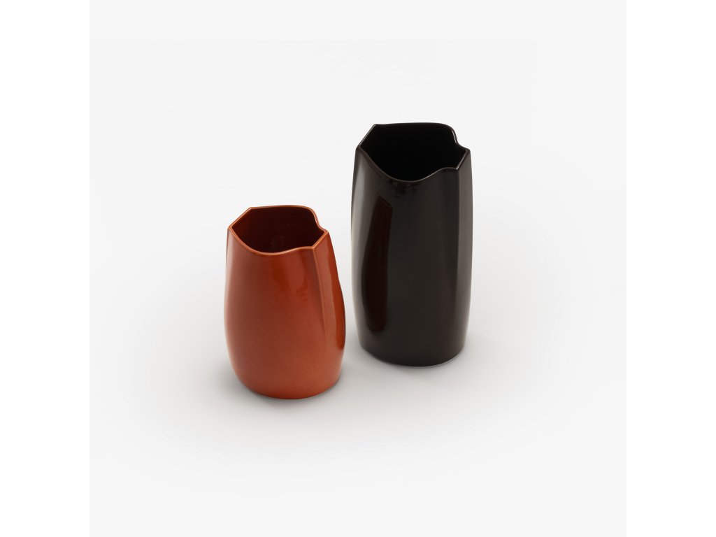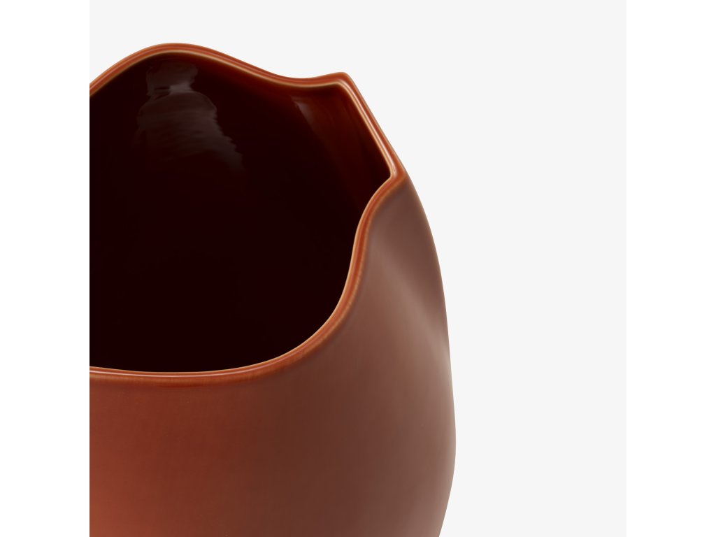 Keramické vázy Morph nabízejí kombinaci všestrannosti a moderní elegance. Jejich výrazné tvary poskytují jedinečné pozadí pro květinová aranžmá, zatímco jejich výrazná barevná paleta – sytá čokoládová a zářivá oranžová – jim umožňuje doplnit různé styly interiéru. Bližší pohled odhalí skrytý detail: silueta okraje připomíná klasický tvar vázy a spojuje tradici s inovací. Lesklá povrchová úprava dodává těmto vázám nádech sofistikovanosti, díky čemuž jsou ideální pro každodenní použití i pro zvláštní příležitosti. Jejich vyvážené proporce a čisté linie představují fúzi umění a současného designu. Váza ze smaltované kameniny s lesklou povrchovou úpravou.